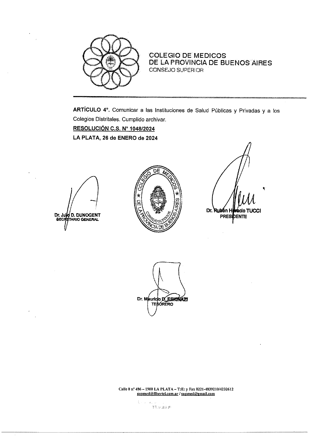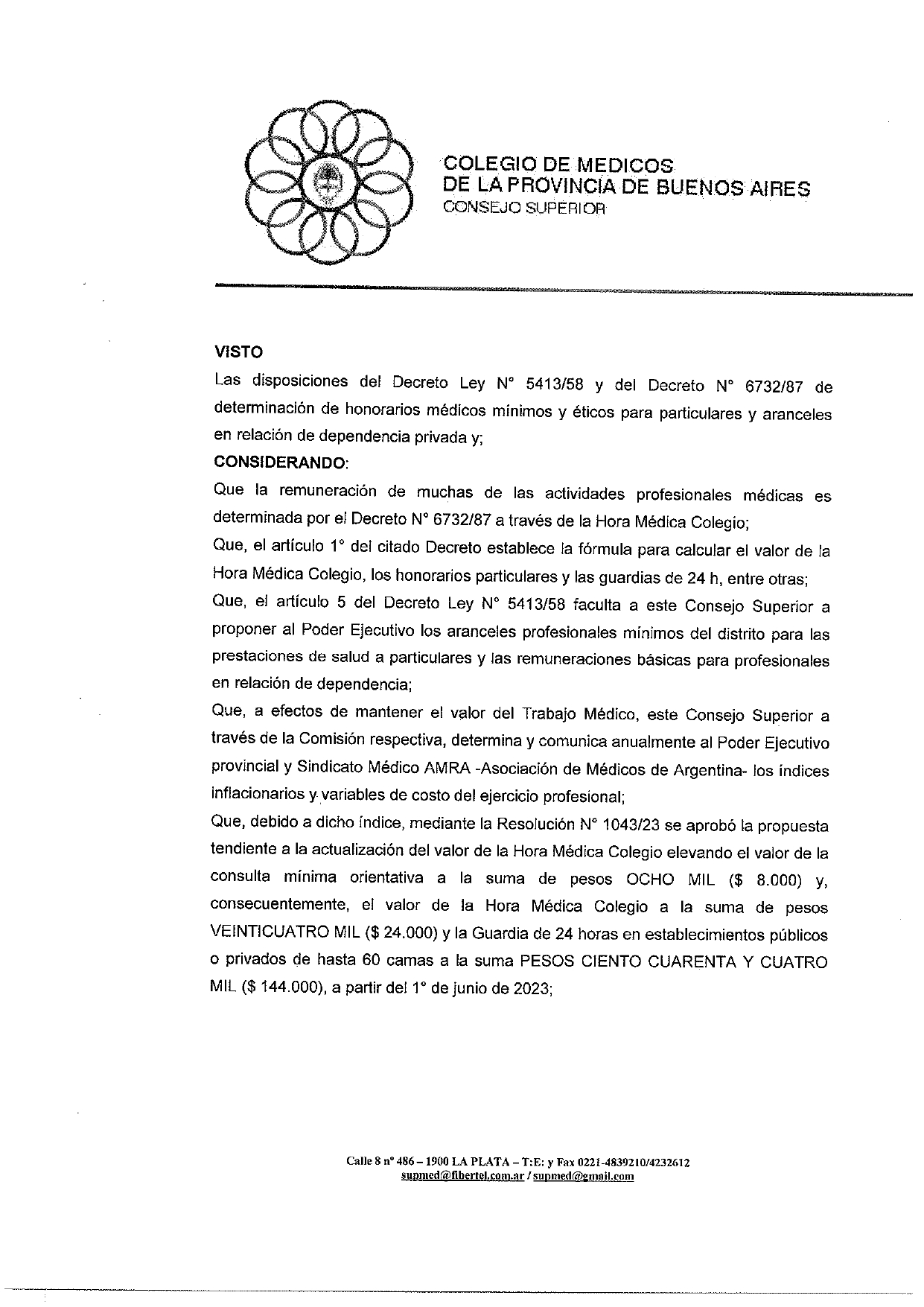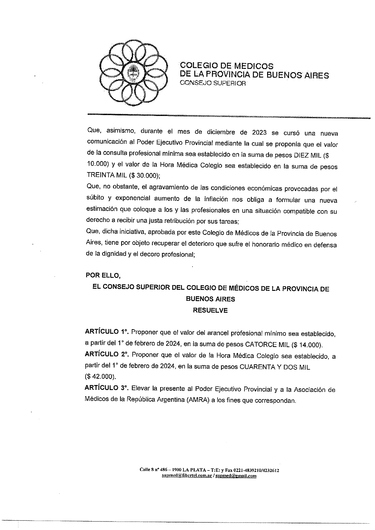El Consejo Superior del Colegio de Médicos de la Provincia de Buenos Aires propone ante el Poder Ejecutivo y la Asociación de Médicos de la República Argentina los valores de Arancel Profesional mínimo de $14.000 y de Hora Médica Colegio de $42.000.