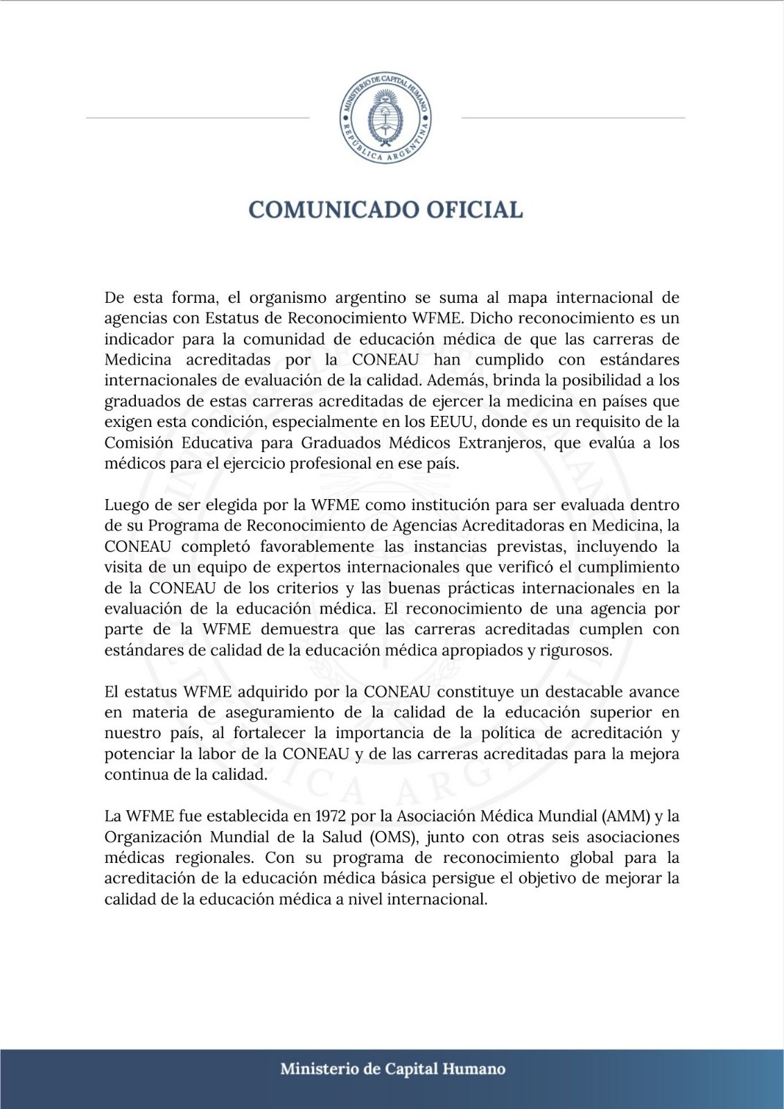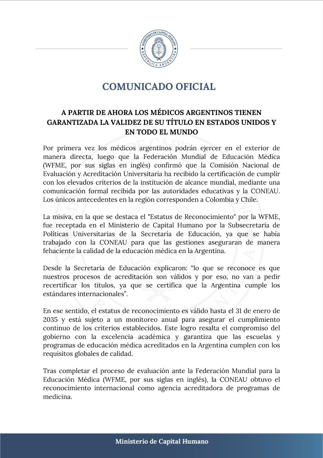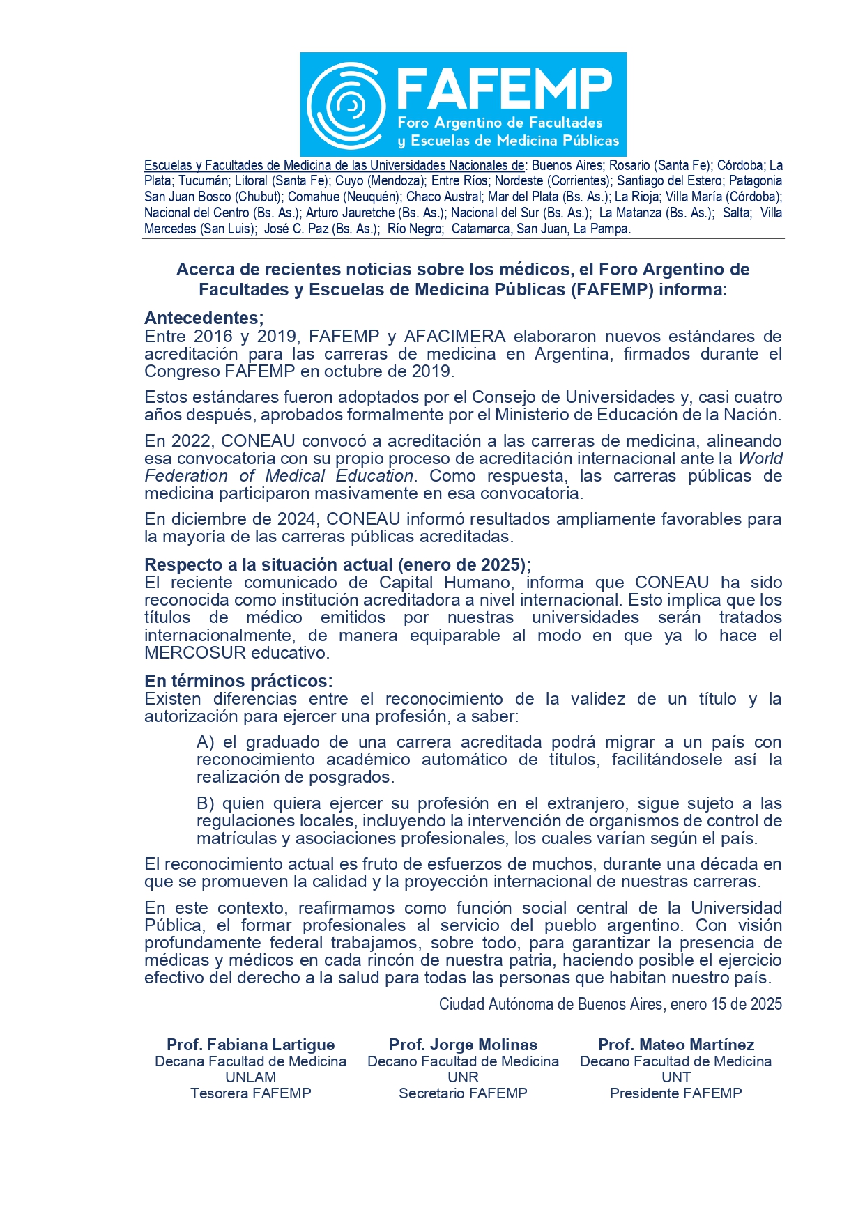 Colegas, con el fin de aclarar aspectos de la información emanada del Ministerio de Capital Humano, respecto a la validez de los títulos de médicos, otorgados por Facultades o Carreras de Medicina acreditadas por la Coneau, donde el acápite menciona: "A partir de ahora los médicos argentinos tienen garantizada la validez de su título en Estados Unidos y en todo el mundo", y que fue magnificada por los medios gráficos, queremos señalar, que este reconocimiento al título de grado cuya certificación proviene de la Federación Mundial de Educación Médica (WFME, por sus siglas en inglés), no implica la habilitación para trabajar de médico, debiendo ajustarse a las regulaciones que establezcan cada uno de los países. Así también los títulos de posgrado solo serán reconocidos en los países que permitan el desarrollo profesional y la especialidad sea considerada crítica para esas sociedades. Para mayor comprensión, adjuntamos nota del Foro Argentino de Facultades y Escuelas de Medicina Publicas FAFEMP.