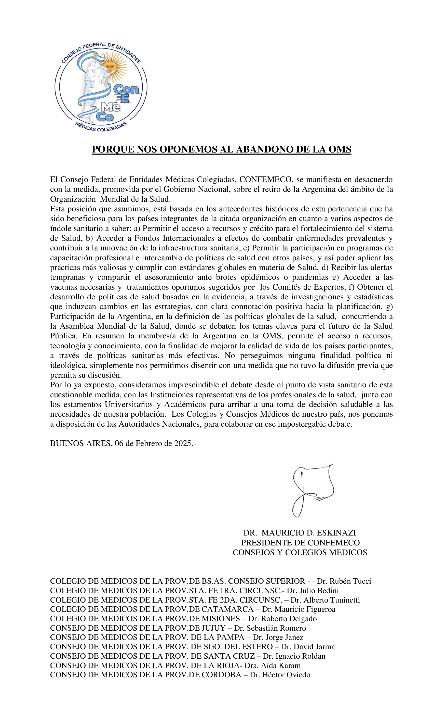 El Consejo Federal de Entidades Médicas Colegiadas, CONFEMECO, se manifiesta en desacuerdo con la medida, promovida por el Gobierno Nacional, sobre el retiro de la Argentina del ámbito de la Organización Mundial de la Salud.