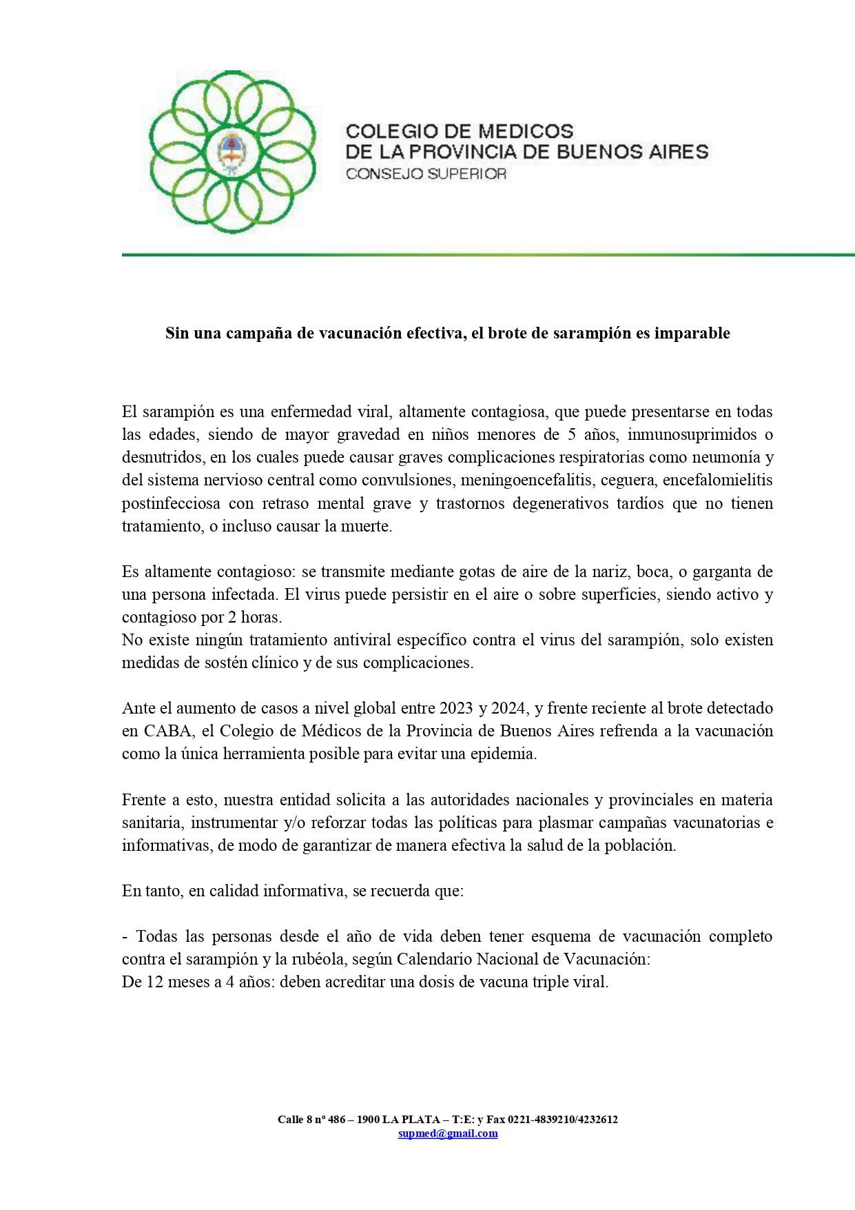 Solicitamos a las autoridades nacionales y provinciales en materia sanitaria, instrumentar y/o reforzar todas las políticas para plasmar campañas vacunatorias e informativas contra el Sarampión.
