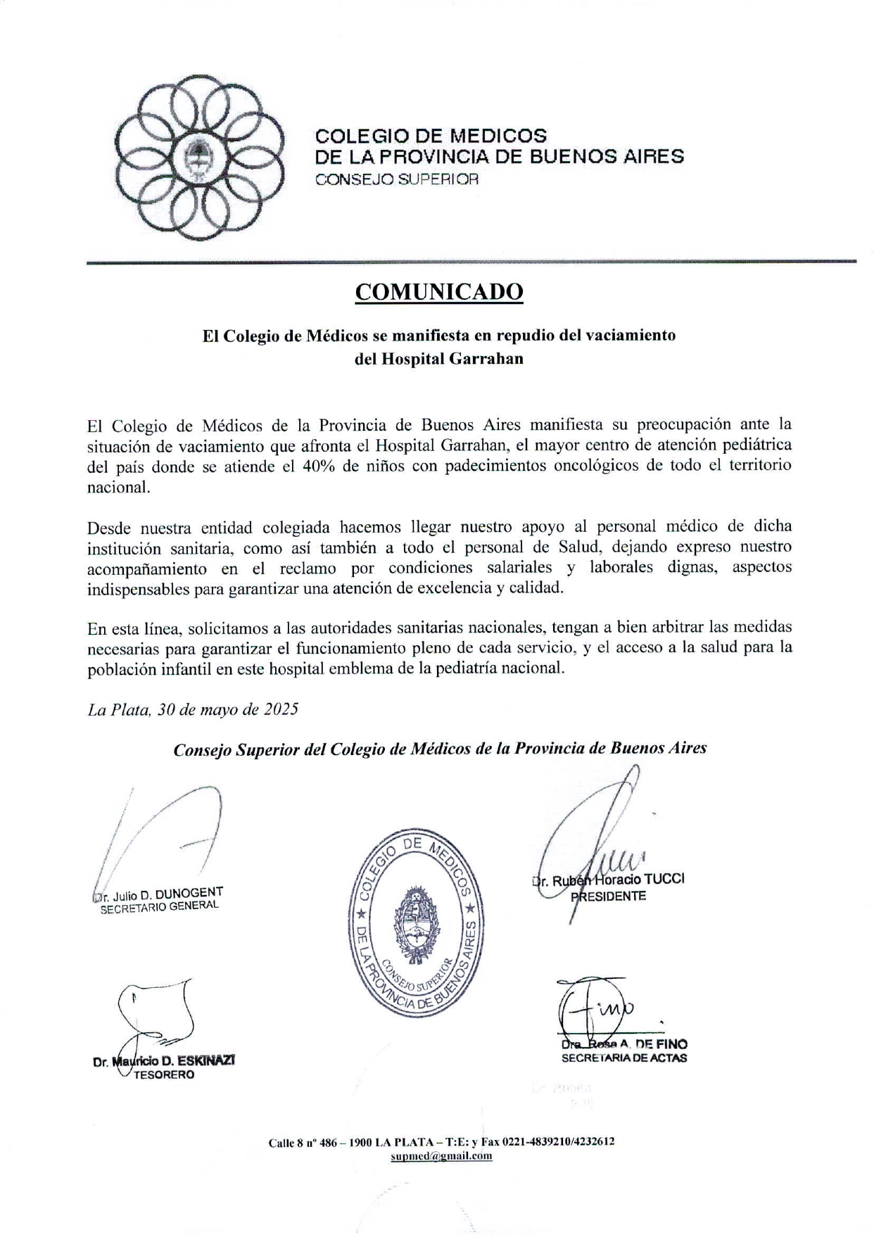 El Colegio de Médicos de la Provincia de Buenos Aires manifiesta su preocupación ante la situación de vaciamiento que afronta el Hospital Garrahan, el mayor centro de atención pediátrica del país donde se atiende el 40% de niños con padecimientos oncológicos de todo el territorio nacional.