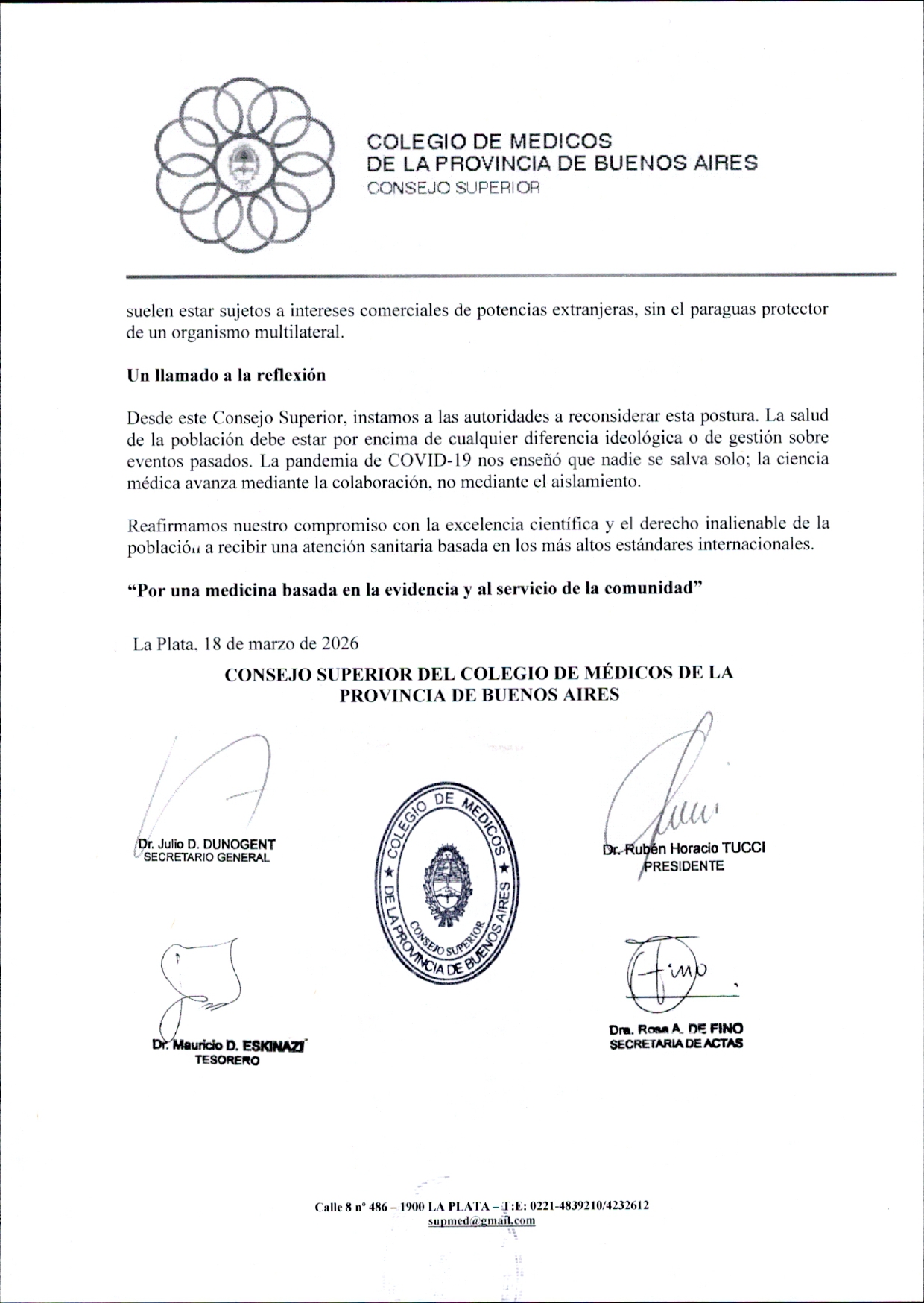 Expresamos el más profundo rechazo del Consejo Superior a la desición del Poder Ejecutivo de hacer efectivo el retiro de nuestro país de la Organización Mundial de la Salud.